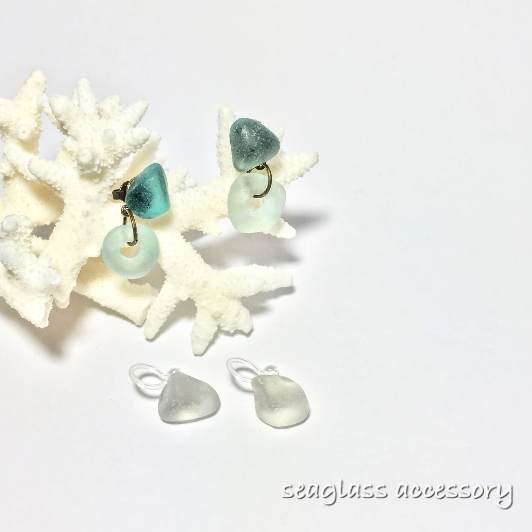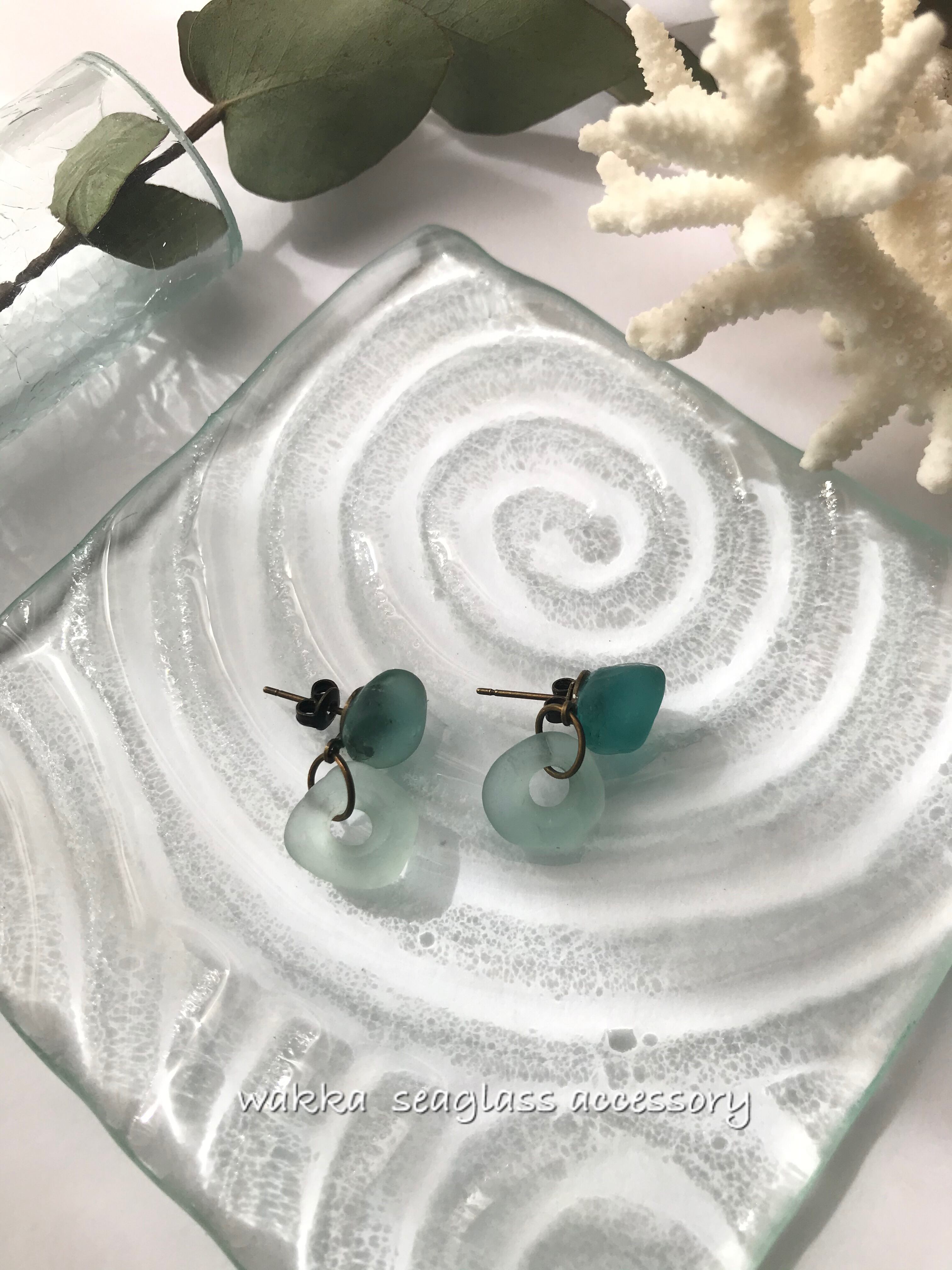 こちらは、厚みのある一粒シーグラスと、形は自然のままで穴を大きく開けた輪っかシーグラスを合わせたピアスです。