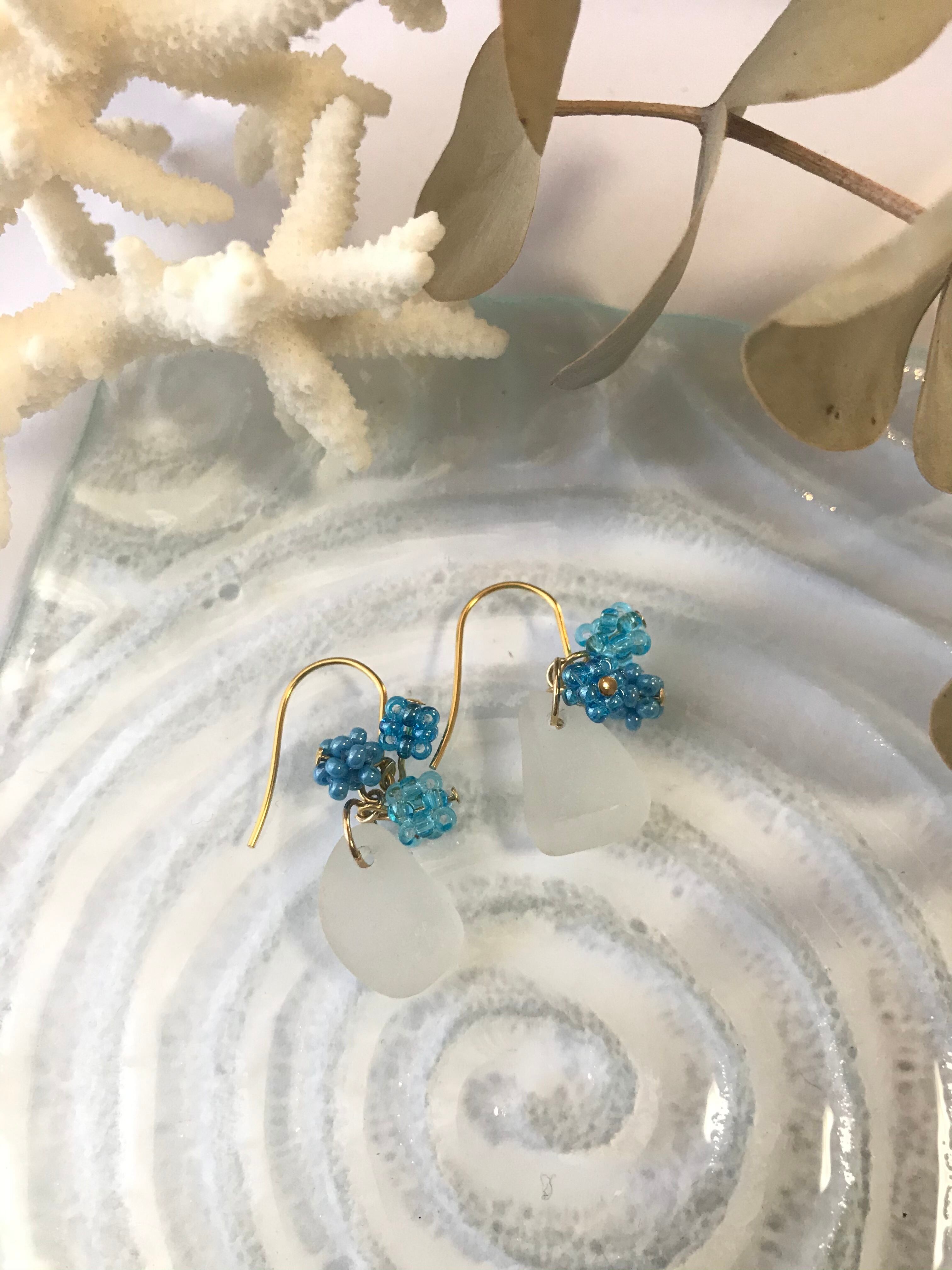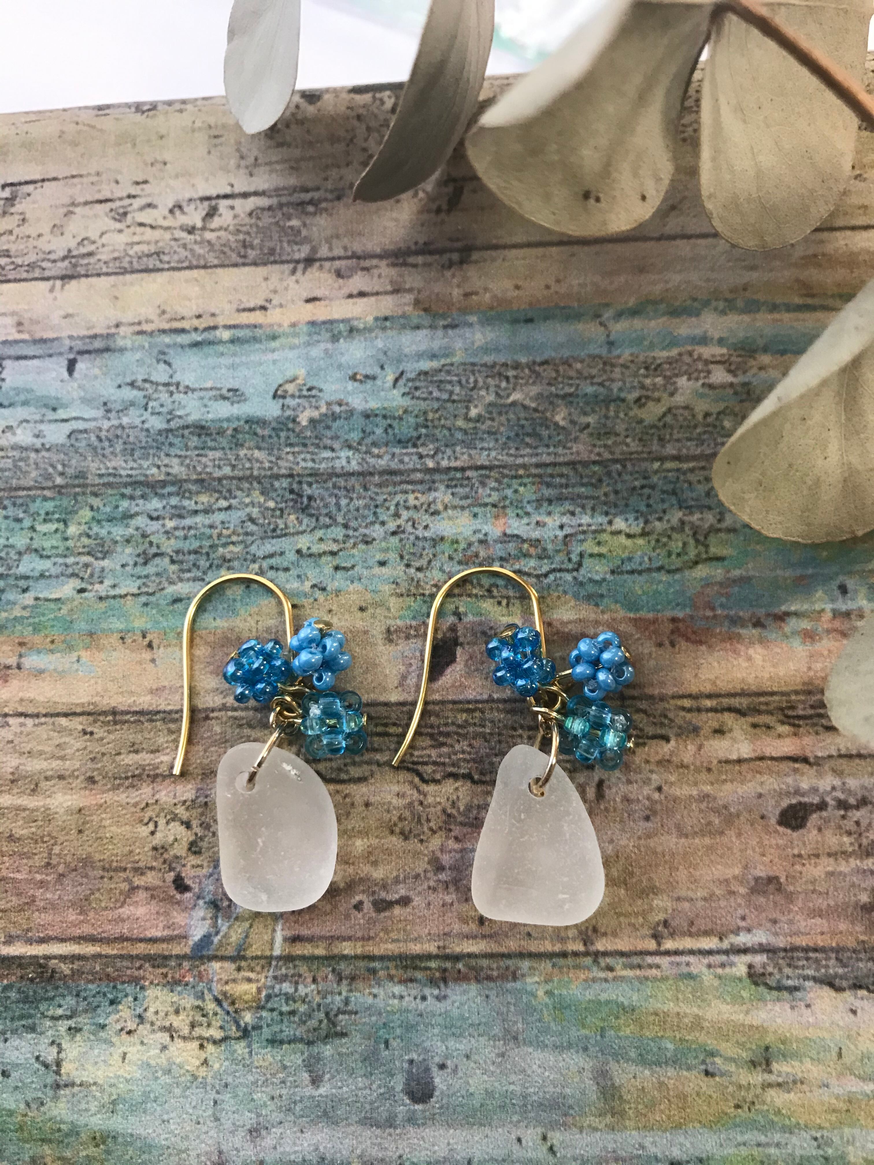 白いシーグラスに水色系のビーズボールを合わせました。白と水色が爽やかな色合いで粒々ビーズボールが可愛らしい印象のアクセサリーです。