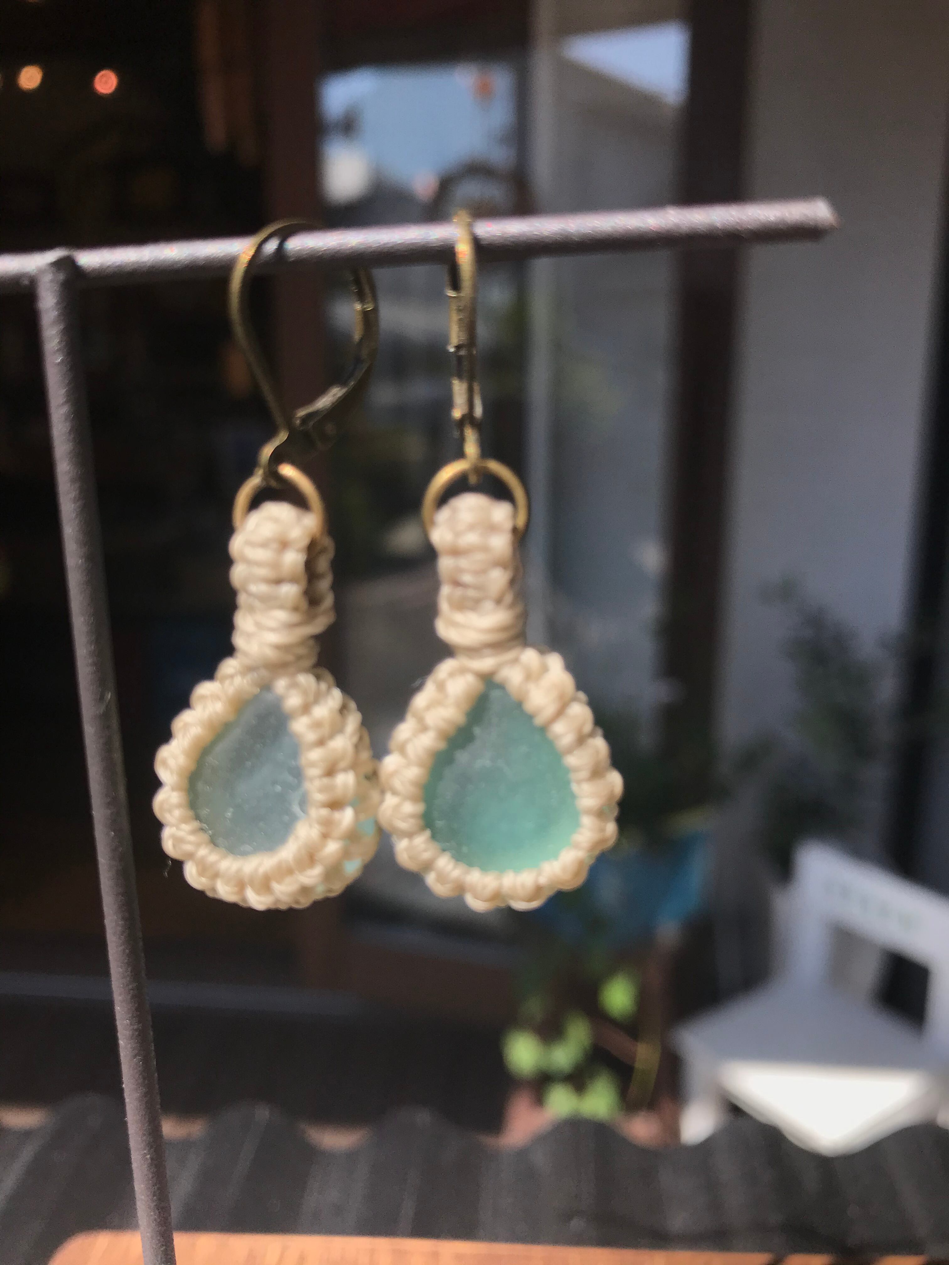 爽やかなブルーグリーンの色合いのシーグラスを、ベージュのワックスコードで包み編んだピアスです。