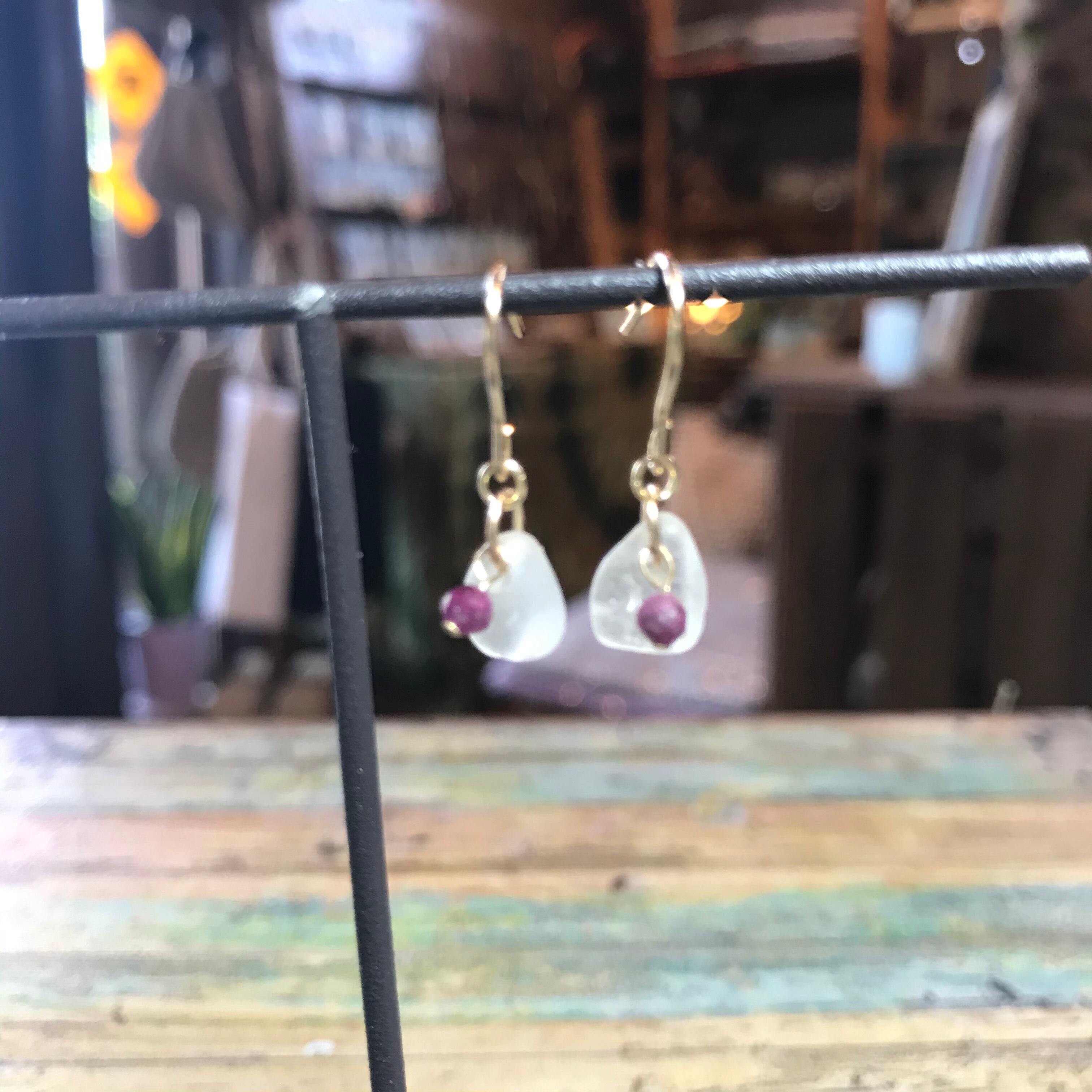 小さな小さな一粒シーグラスと天然石ビーズのルビーをアクセントにしたプチピアスです。