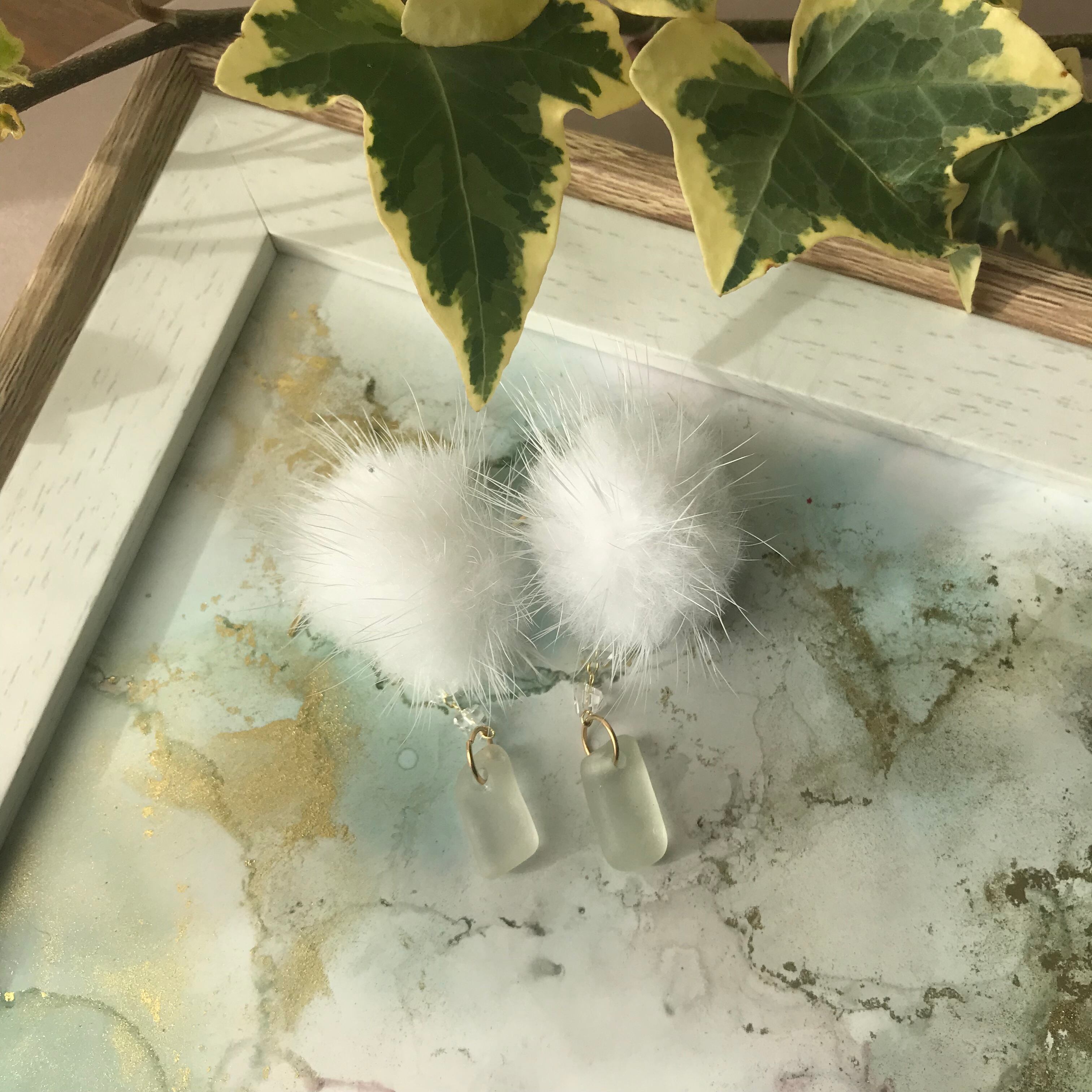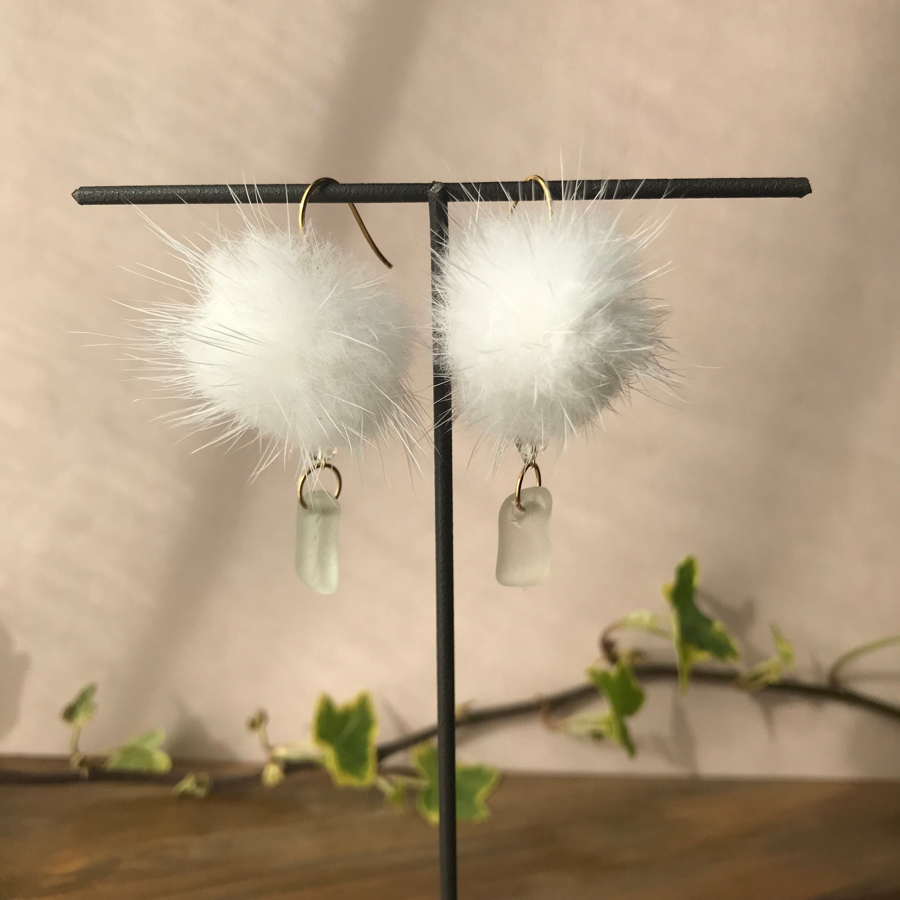 ホワイトシーグラスとホワイトファーのピアス クリスマスプレゼントに