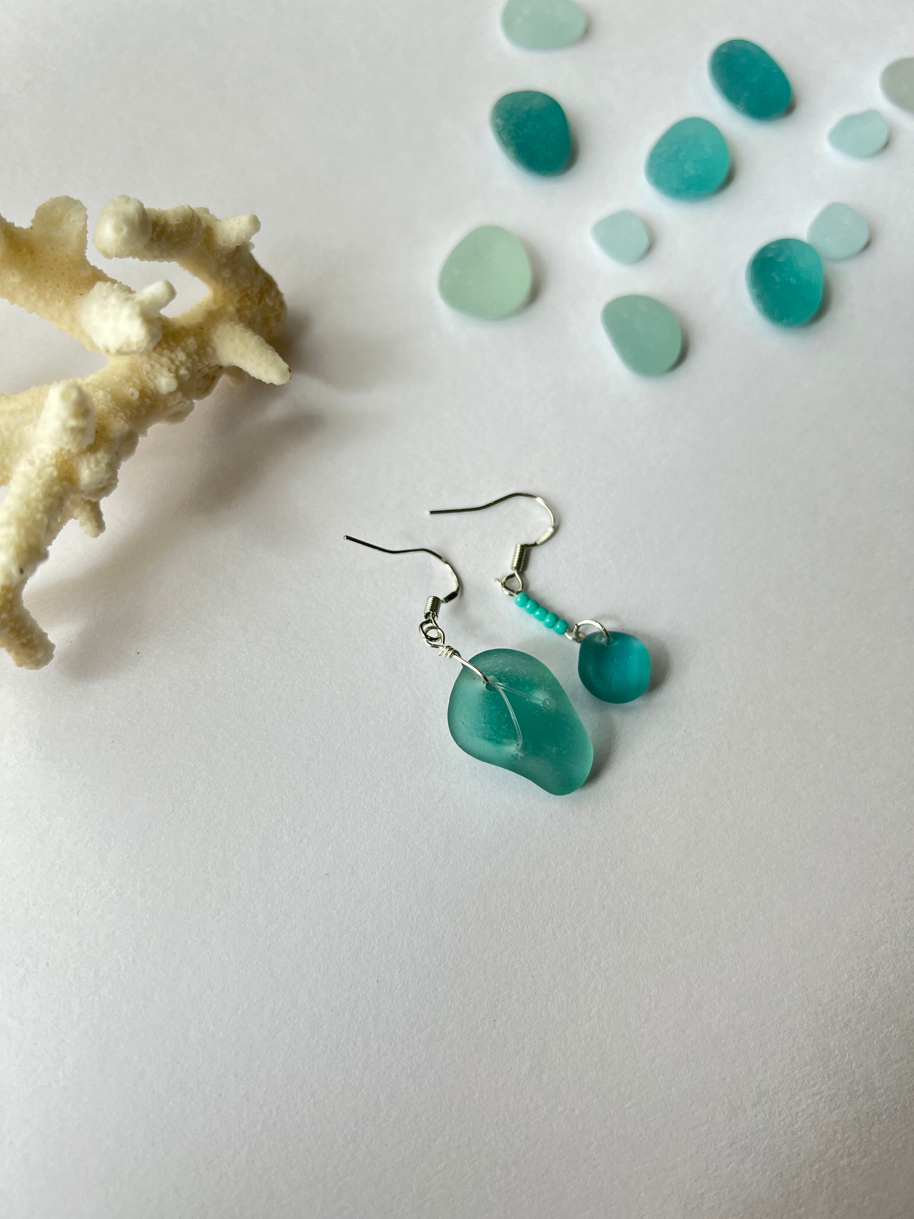 片方は同じブルーのシーグラスとビーズを合わせました。左右アシンメトリーをお楽しみください。